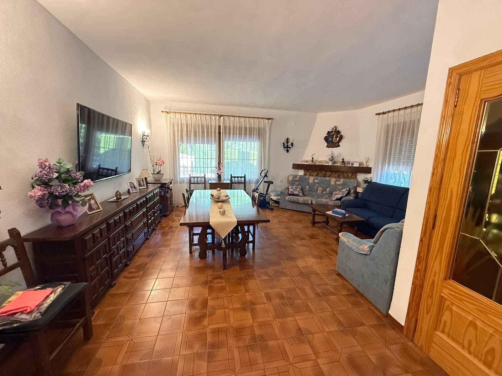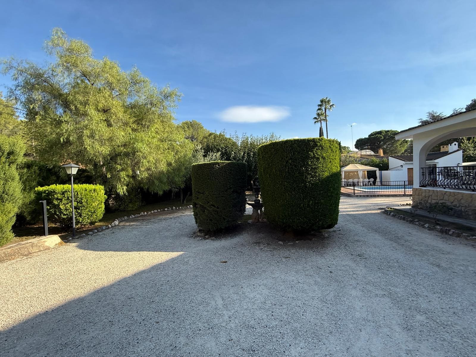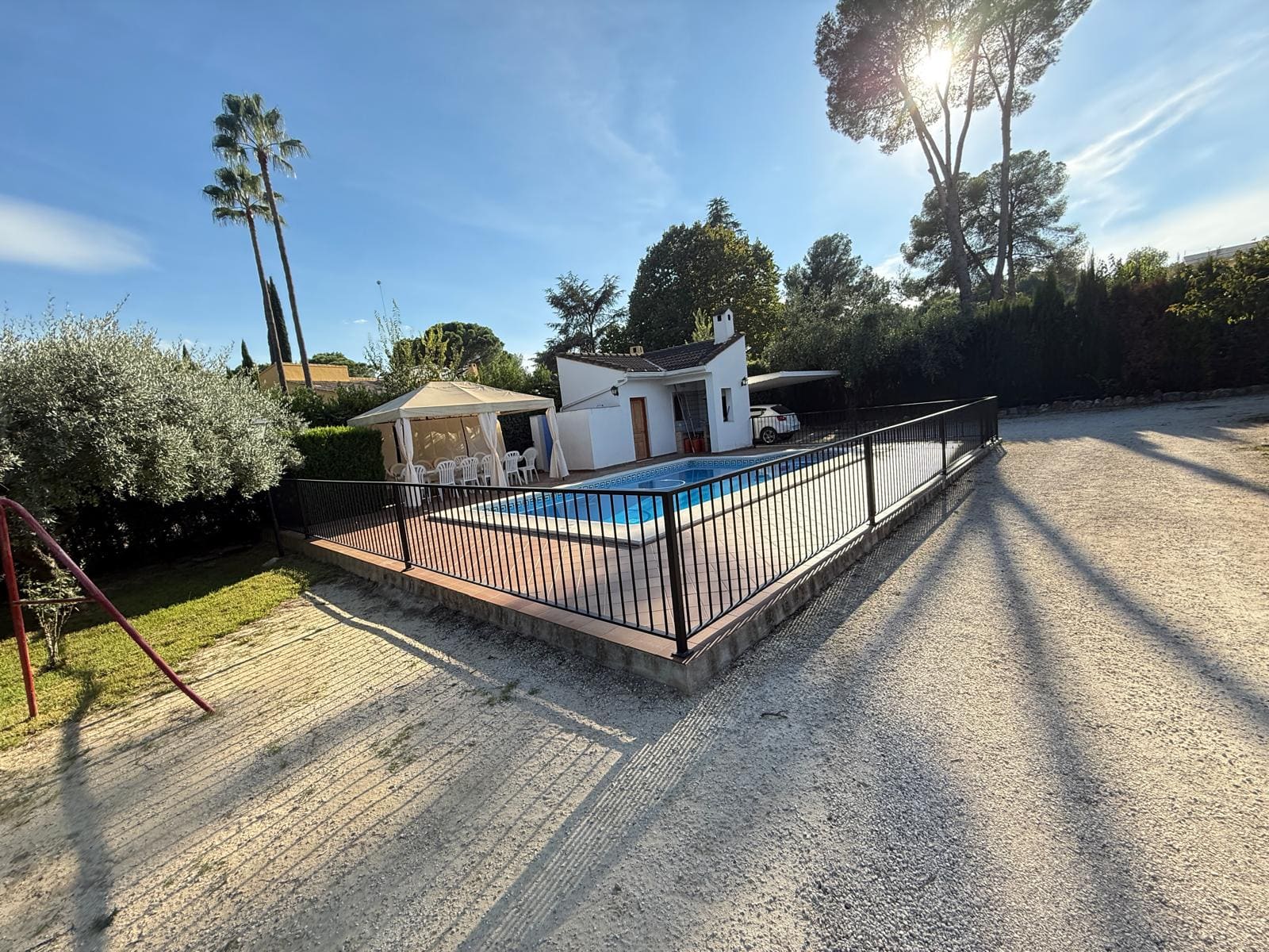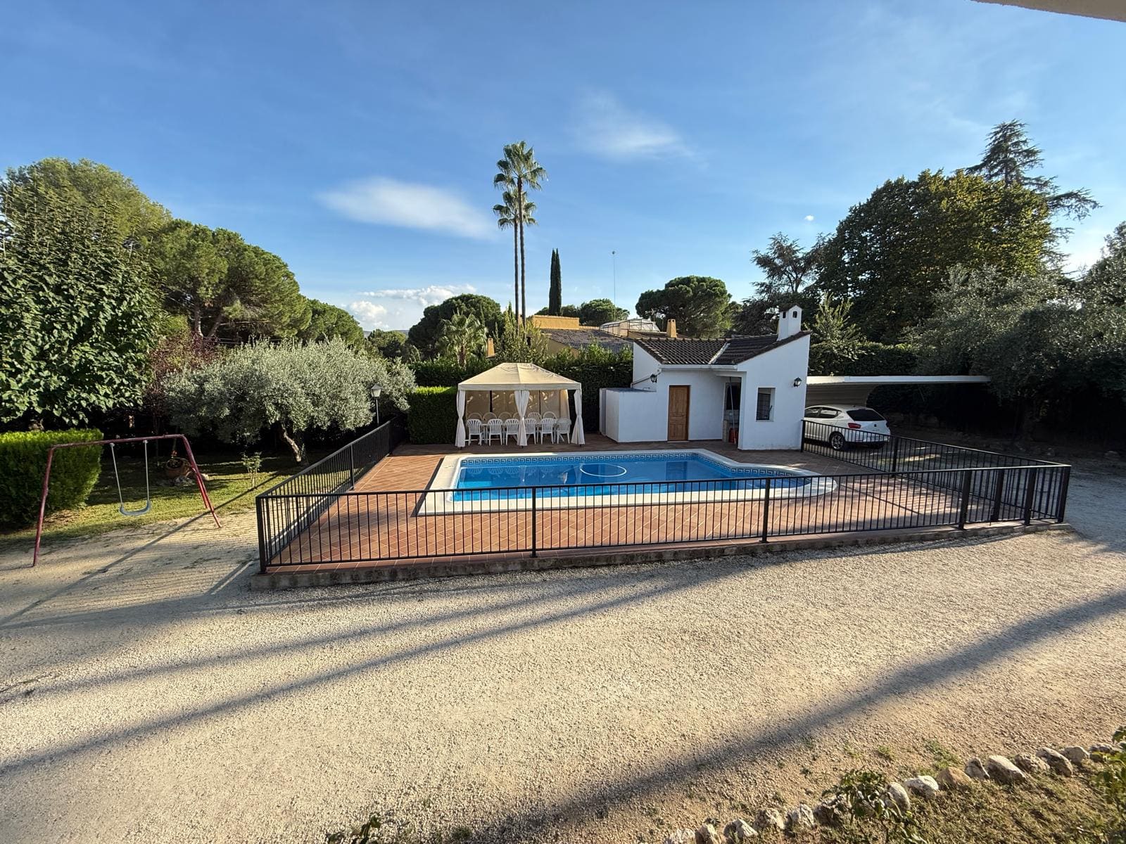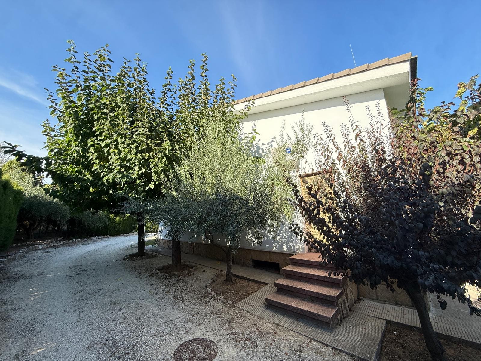 En el exterior, la parcela ofrece todo lo necesario para disfrutar al aire libre: piscina, zona de barbacoa, terreno con árboles frutales y cerramiento completo con muro, además de puerta automática de acceso.