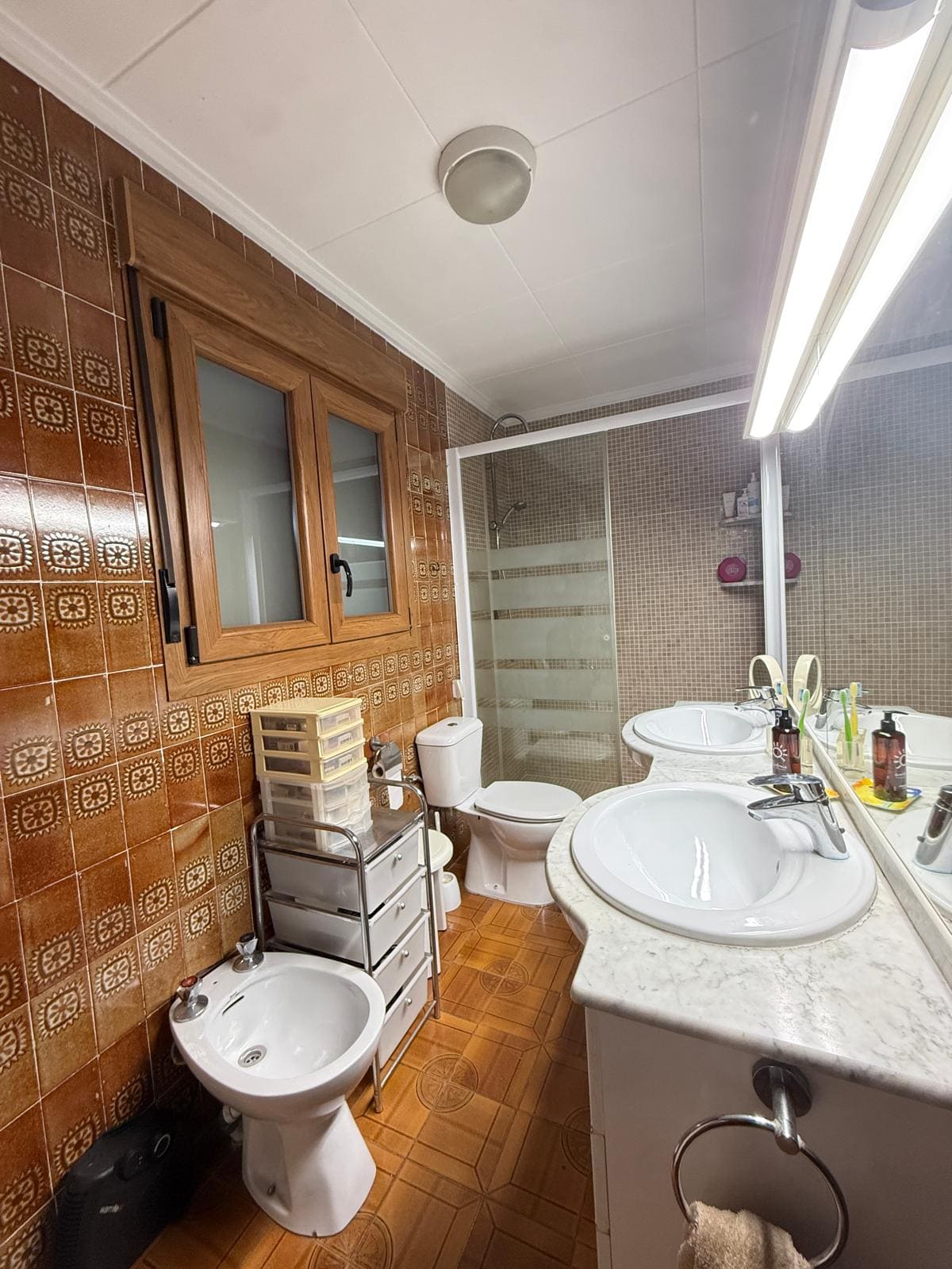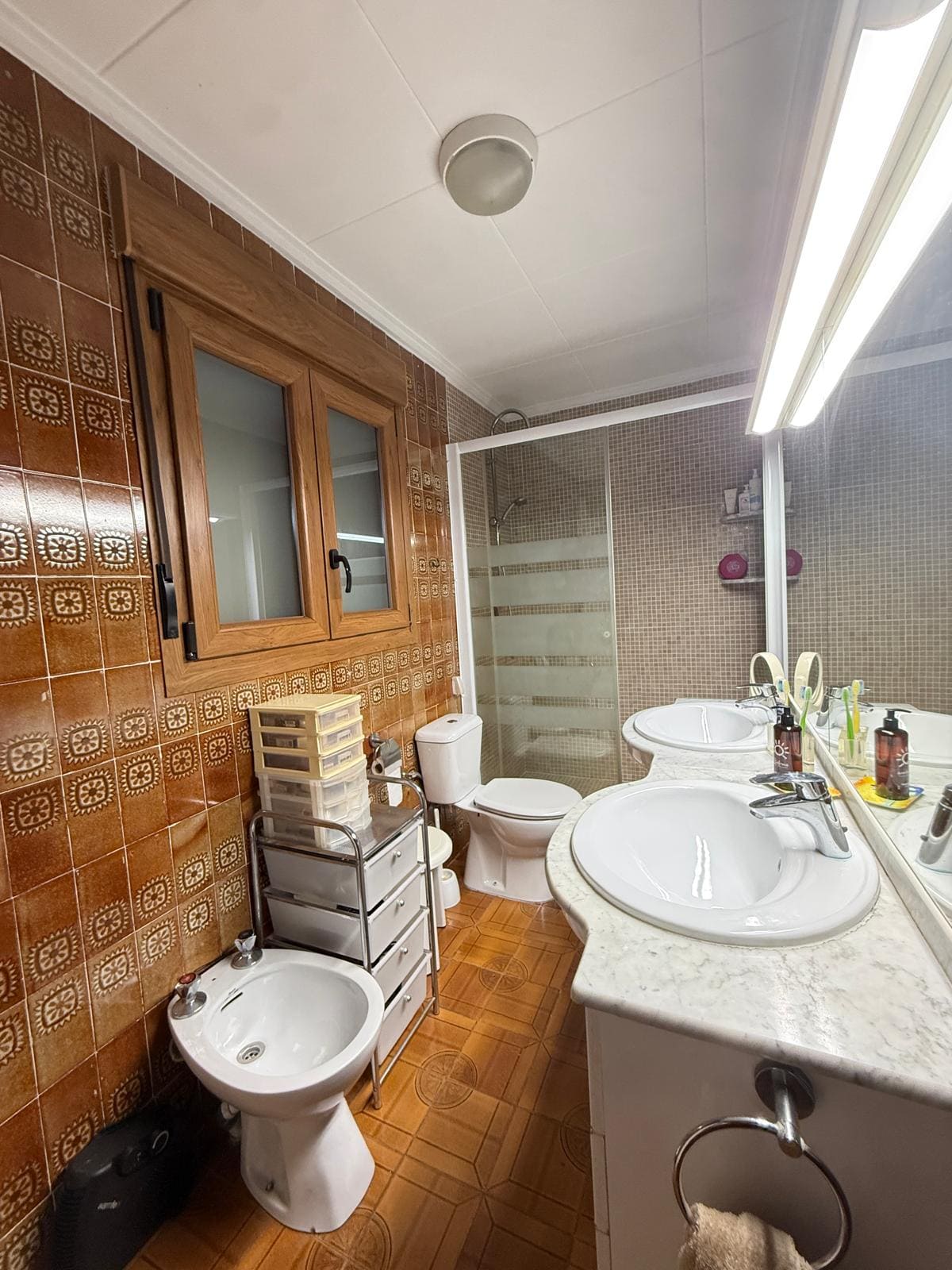 La distribución incluye un salón-comedor, aire acondicionado frío/calor, una cocina equipada con bancada de mármol, 3 baños completos con ducha y tres dormitorios con armarios empotrados.